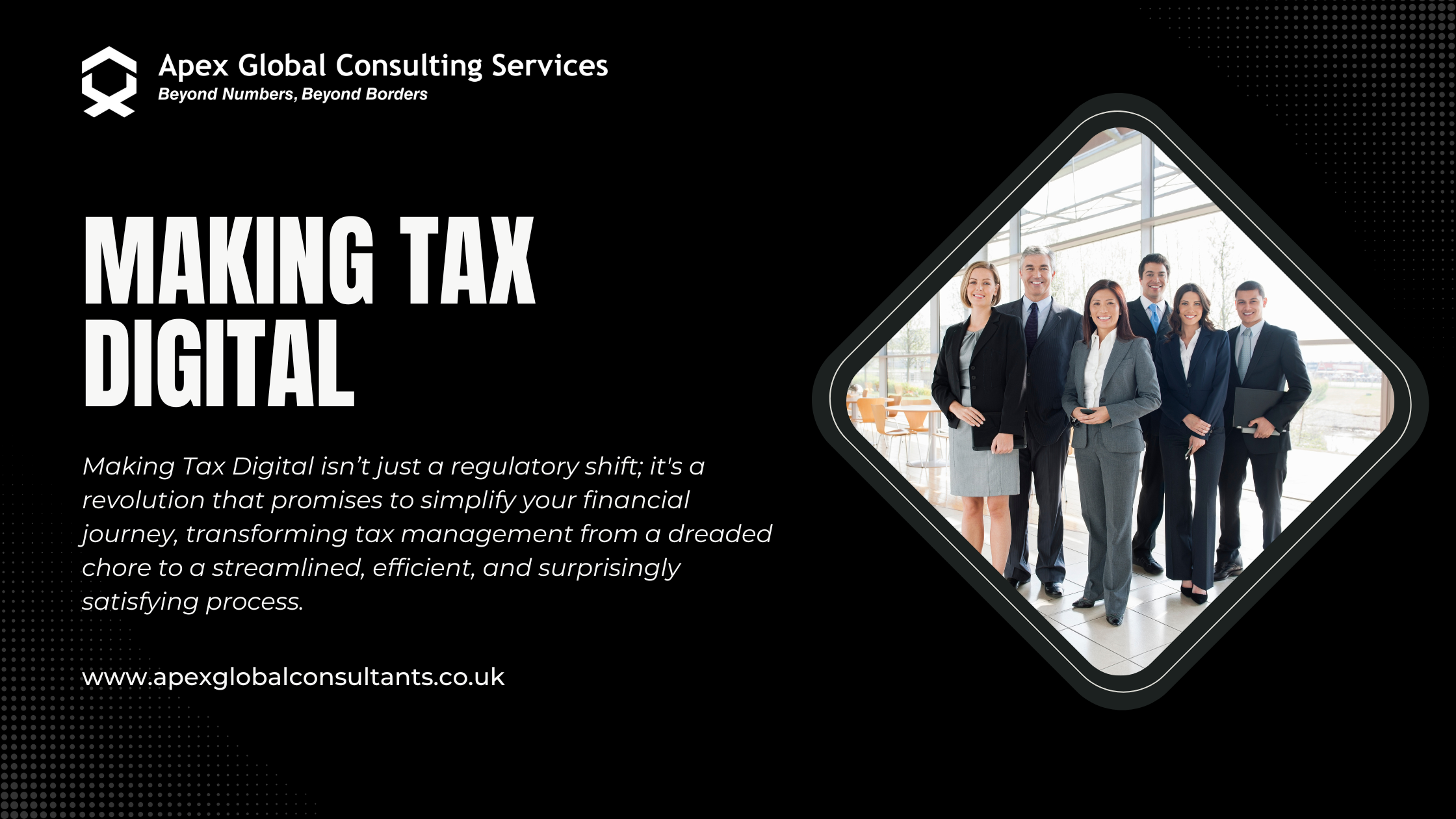 Apex Global Consulting Services helps clients comply with MTD by selecting compatible software, maintaining digital records, submitting quarterly updates, and finalizing year-end returns. We also provide training to ensure a smooth transition ahead of the 2026 mandate. Contact us to help guide you through the process with ease.
